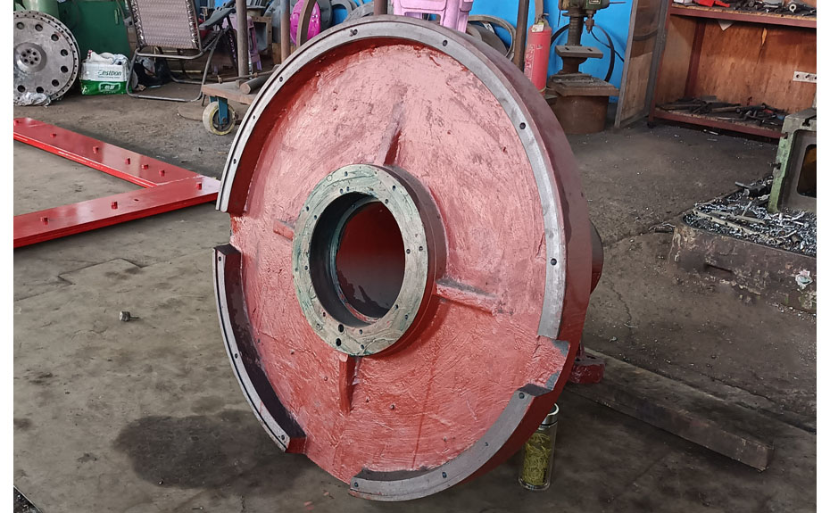 双级活塞推料离心机机座组合主要由油箱、机座、油冷却器等件组成,其中机座为整体式铸造件,内装轴承座并支承回转件,该件用标准紧固件固定于油箱上,形成整机的座子。此外,机座组合通过弹性基础放置在橡胶制的弹性减振垫上,以便吸收离心机在工作过程中产生的振动,从而有效地保证离心机附近机器设备正常运转和建筑物的安全,延长机器的使用寿命。
